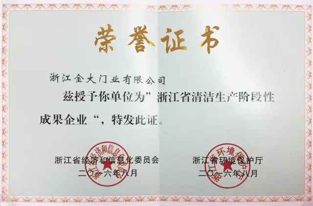 金大门业被授予“浙江省清洁生产阶段性成果企业”荣誉称号